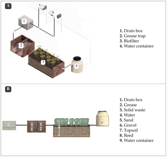 The drainage system of the bathroom sinks is connected to a drainage box that collects gray water. Subsequently, this water passes through a grease trap consisting of two chambers: the first chamber separates water with grease from solid waste, while the second chamber separates grease from gray water. Then, the gray water passes through a biofilter, where wetland plants transfer oxygen to the submerged root zone, enabling the biological degradation of contaminants and organic matter by microbes. Finally, the purified water is stored in a water tank for reuse, as observed in Figure 20A. Similarly, Figure 20B illustrates the components of a biofilter, including the drainage box, the grease trap containing grease, solid waste, and water, and the biofilter itself, composed of sand, gravel, topsoil, and reeds, ending with a water storage container.