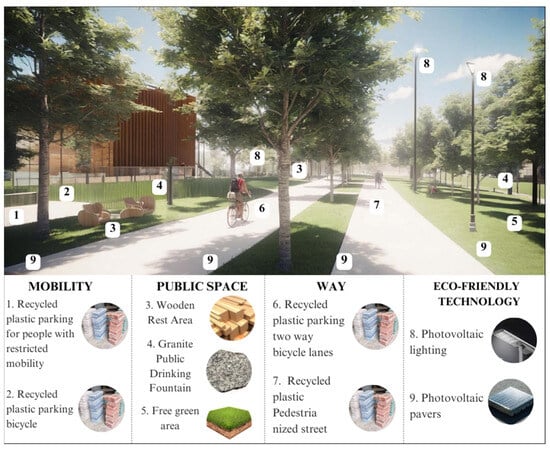 The layout of pathways, pedestrian streets, bike lanes, and green areas is presented as a crucial strategy for creating healthy and suitable public spaces for people, encouraging the use of alternative transportation, and promoting greater activity in public spaces by local residents. In this context, the use of xerophilous vegetation plays a decisive role due to its ability to adapt to low water consumption and the local climate. Therefore, trees such as the Molle Costeño (Schinus molle), Árbol de Júpiter (Lagerstroemia indica), and Palo de Borracho (Ceiba speciosa) are chosen for their broad canopies that provide shade, along with shrubs like Cucarda (Hibiscus rosa-sinensis), Margarita Azul (Felicia amelloides), and Rosa Rugosa (Rosa rugosa). Additionally, ground covers such as Grass Paspalum (Paspalum spp.) are used, which allows for activities on it without incurring high maintenance costs; Gazania (Gazania rigens), Flor de Seda (Aptenia cordifolia), and Lobularia Marítima (Lobularia maritima) are used to complement the vegetation. These elements are combined with eco-friendly materials that can be sourced from local materials and industries, such as clay and crushed concrete pavers, wooden benches, and local stones, along with recycled materials like tires, rubber, wood, ropes, and bottles, which can be used for ground cover as well as benches and playgrounds. Moreover, technological innovations such as photovoltaic pavers and public lighting with solar panels are integrated, promoting community development and environmental awareness through technological innovation, as shown in Figure 22.