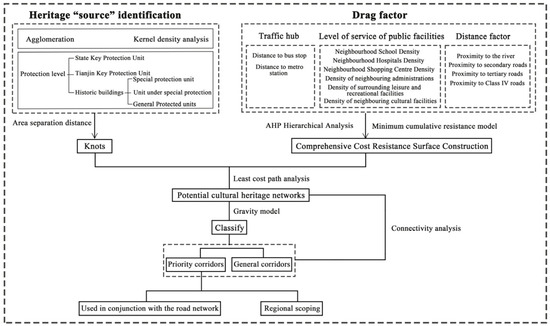 This study focuses on Tianjin’s historical urban area to explore the development of a cultural heritage corridor system. Initially, this study conducts a spatial morphological analysis of cultural heritage sites in the historical district, treating these sites as this study’s starting “source”. Subsequently, considering the social, functional, accessible, and usable aspects of these heritage sites, the MCR is applied regionally to create a comprehensive resistance cost surface, uncovering the potential network of cultural heritage corridors. This study then uses the GM to calculate mutual attractions between heritage sites, enabling a hierarchical classification of the corridors. Finally, this study defines the regional scope of the cultural heritage corridors, focusing on protection and tourism development. Figure 1 illustrates this study’s methodological framework.