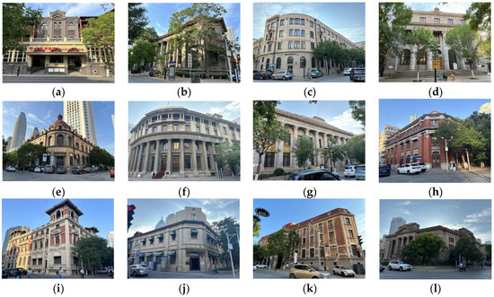 Current situation of the historic cultural districts in Tianjin. ((a) Tianjin Astor Hotel, (b) Former Site of Chartered Bank, (c) Former Site of Lane Crawford, (d) Former Site of Citibank, (e) Former Site of the Tianjin Branch of the Russo-Chinese Bank, (f) Former Site of Industrial and Commercial Bank of China-France, Tianjin Branch, (g) Former Site of the Yokohama Specie Bank Building in Tianjin, (h) Former Site of the Bank of Chosen, (i) Former Site of Indo-China Agency Bank/Calyon Bank, (j) Former Site of the Beiyang Industrial and Commercial Bank in Tianjin, (k) Former French Municipal Committee in Tianjin, (l) Former Site of Hongkong and Shanghai Banking Corporation in Tianjin).
