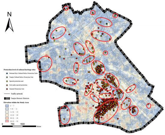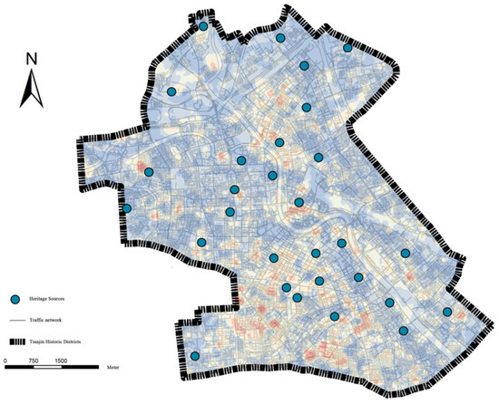 Tianjin’s official statistics indicate that the historic urban area contains 63 nationally protected heritage sites, 145 municipal heritage sites, and 798 historical buildings. These sites constitute 85.9% of Tianjin’s cultural heritage, with nationally protected sites making up 84%. This underscores the area’s role as a principal hub of Tianjin’s cultural heritage. As illustrated in Figure 5, Kernel density analysis shows a high concentration of heritage sites in the Wudadao tourist area. Centered around the Haihe River scenic area, the heritage sites are clustered along the riverbanks, forming a solid base for developing cultural heritage corridors. A significant concentration of heritage sites is also evident in the historic urban area’s northern part.