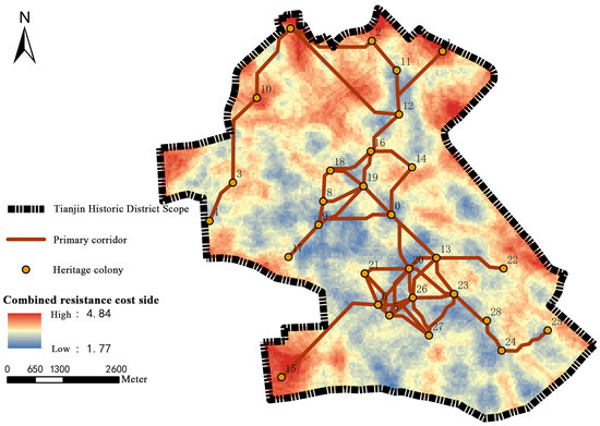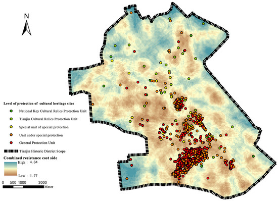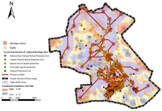 Constructing a comprehensive resistance cost surface is a fundamental prerequisite for scientifically identifying cultural heritage corridors. This study focuses on the historic urban area of Tianjin, located in the North China Plain. In our research, factors such as land use types, natural elements, distance from public transportation stops, distance from traffic networks, and the level of surrounding public facilities were selected as resistance factors and assigned weights. We precisely selected seventeen resistance factors as the baseline for model construction. Based on these benchmarks, the resistance factors were quantitatively assigned values to assess their level of hindrance to cultural heritage leisure activities. The scores of the resistance factors ranged from 1 to 5, with higher scores indicating greater resistance and thus less suitability for heritage activities, and vice versa. Ultimately, a comprehensive resistance surface was constructed through a weighted summation method. The weights of each factor were determined using software for the Analytic Hierarchy Process (AHP) and validated through a consistency test.