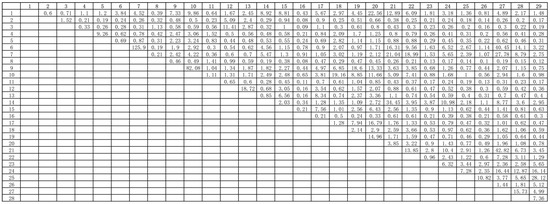This study used the comprehensive resistance cost surface and spatial analysis tools, such as cost distance and path, to calculate the minimum cost paths between heritage settlements, identifying all potential heritage corridors. Employing the GM, an interaction matrix between heritage settlements was constructed [31], and quantitative methods were used to calculate the interaction forces among them [32]. This method enabled the assessment of the relative importance of each potential corridor and the identification of key corridors [33]. The formula used in this analysis is as follows: