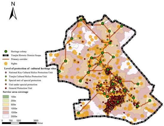 Building upon this foundation, this study utilized the Service Area tool within the ArcGIS Network Analysis toolkit to conduct a detailed analysis of the network topology between each heritage site and the surrounding attractions. By setting various interruption distance values (100 m, 200 m, 500 m, 1000 m, and 1500 m), different levels of service areas were distinguished. The results of the service area analysis (Figure 14) indicate a close connection between heritage sites along the corridor from the northeastern to the southern parts of the study area. Particularly in the south, the six heritage sites are significantly interconnected, making this region a core development area within the corridor space.