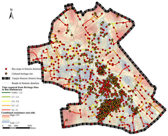 Finally, although this study provides important insights into the impact of social factors on heritage leisure activities in the historic urban area of Tianjin, it also has some limitations. Specifically, this study primarily focuses on social factors, with less consideration given to natural factors. Since the area is located in the North China Plain where land use is relatively uniform, natural factors such as vegetation coverage and altitude vary little within the study area and seem to have a minor impact on heritage activities. Therefore, in constructing the comprehensive resistance cost surface, this study prioritized three main social factors: the distance from heritage sites to public transportation stops, the connectivity of the transportation network, and the service level of nearby public facilities.
