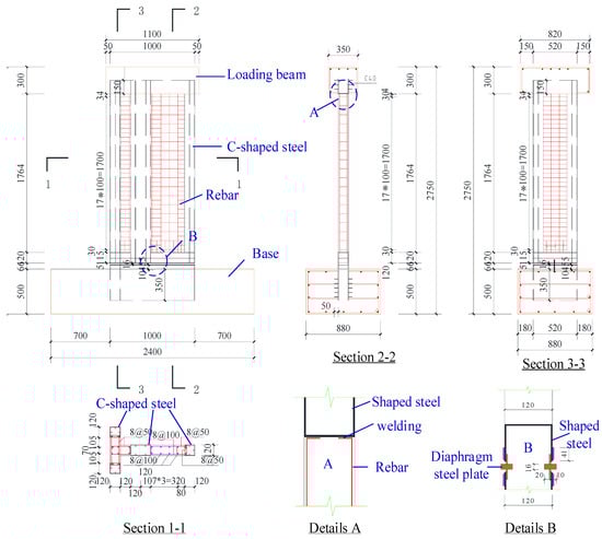 Based on an actual project structure, a C-shaped steel frame composite T-shaped shear wall (TSCCW) specimen with a scaling ratio of 1/2 was designed and fabricated. The details of the specimen are shown in Figure 1. C-shaped steel frames were arranged at both sides of the flange, the center end of the web and near the web and flange of the TSCCW specimen. The top of the wall had a built-in steel plate welded to the top to avoid concrete damage at the top corners. A steel frame was provided at the bottom of the wall to avoid concrete damage at the bottom corners while achieving plastic transfer. The width of the shear wall is 1000 mm, and the effective height is 2000 mm. The thickness of the steel plate is 2.86 mm, and the diameter of the hoop and the longitudinal reinforcement in the concrete wall is 8 mm.