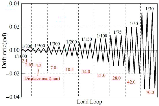 Horizontal loading: Horizontal loading adopts displacement control corresponding to each displacement angle. The first and second levels are loaded for 1 cycle, and the third level is loaded for 3 cycles until the specimen is damaged and cannot be further loaded or the load capacity drops to less than 85% of the maximum load capacity of the test. The horizontal loading process is shown in Figure 3.