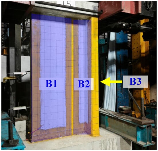 During the loading of the specimens, the development of concrete cracks and damage to the specimens was recorded at the peak of the cycle at each level of loading. In order to facilitate the description of the experimental phenomena during the loading process, the specimens were divided into three regions, B1, B2, and B3. Area B1 corresponds to the web edge of the first concrete position of the specimen TSCCW; area B2 corresponds to the corner position where the web and flange of the specimen TSCCW meet; area B3 corresponds to the back of the flange of the specimen TSCCW. The specimen area division is shown in Figure 4.