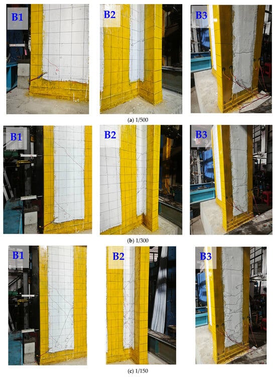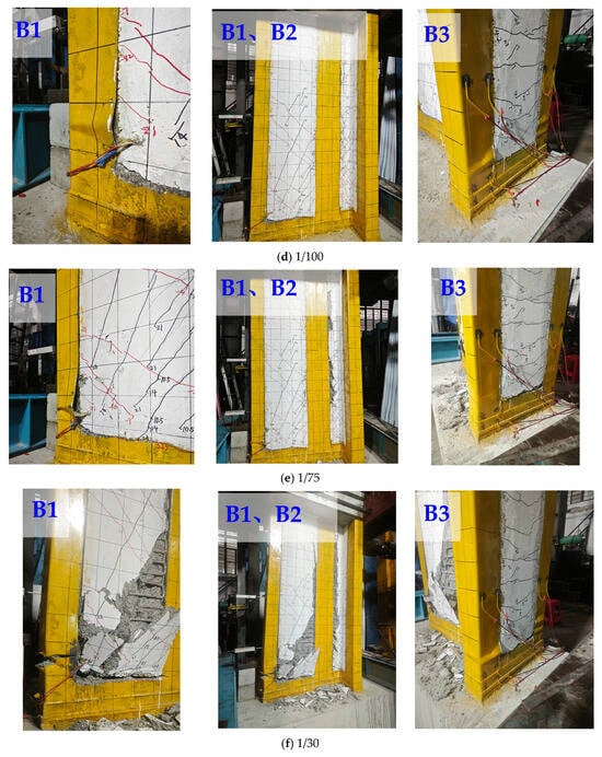 The failure process of the specimen is shown in Figure 5. When the drift ratio is less than 1/500 (2.1 mm), the specimen deformation is small, with no obvious phenomena. At a drift ratio of 1/500 (4.2 mm), a diagonal crack appears near the corner in the B1 and B2 areas, measuring 20 mm in length and 0.08 mm in width, along with a transverse crack in the B3 area. Increasing the drift ratio to 1/300 (7 mm) results in new vertical cracks in the B1 and B2 areas, extending the existing cracks to a maximum width of 0.18 mm, and more transverse cracks in the B3 area, with a maximum width of 0.08 mm. At a drift ratio of 1/150 (14 mm), the cracks in the B1 and B2 areas continue to grow, and cracks cover the entire height of the B3 area, with a maximum width of 0.53 mm. At a drift ratio of 1/100 (21 mm), the corners of the steel plate in the B1 and B3 areas bulge, indicating yielding. Finally, at a drift ratio of 1/30, the corners of the steel frame in the B1 area fracture, and large chunks of concrete fall off in the B1 and B2 areas, leading to specimen failure.
