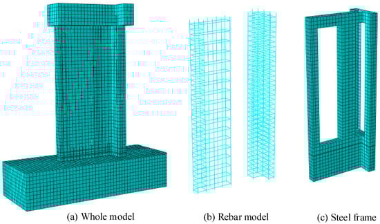 The finite element model of the specimen TSCCW was established using the finite element software ABAQUS 2020. The dimensions of the finite element model were consistent with the test specimen. The finite element model is shown in Figure 7. The model contains the top beam, base, wall, rebars and steel frame. The top beam, base and wall were modeled using three-dimensional hexahedral solid elements (C3D8R). The reinforcement bars were modeled using two-node linear 3D truss elements (T3D2). The steel frames were modeled using S4R shell elements. The mesh convergence analysis was carried out before model calculation, and the mesh size was set to 50 mm under the premise of ensuring calculation accuracy and speed. There was no slip between the rebars and the concrete before specimen damage, so the interaction between the steel bars and the concrete was modeled as tied. Disengagement between the steel frame and the concrete occurred when the specimen was about to fail, so the interaction between the steel frame and the concrete was modeled as frictional contact.