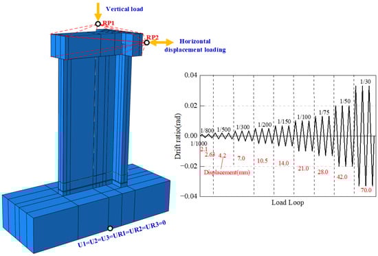 Figure 8 illustrates the boundary constraints and loads applied to the specimen. Fixed constraints, i.e., U1 = U2 = U3 = UR1 = UR2 = UR3 = 0, were set on the base surface. Two reference points, RP1 and RP2, were set to couple with the top beam. The load application was set in two steps: the first step was to apply a vertical load at point RP1 to simulate axial pressure, and the second step was to apply a horizontal load at point RP2 to simulate the reciprocating load. The loading regime for horizontal displacement was consistent with the test.