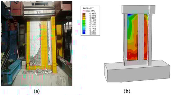The failure behavior in the finite element analysis and experiment is shown in Figure 9. It can be seen that the crack location of the concrete is basically consistent with the distribution of the finite element damage area. The corners of the steel frame buckled significantly when the specimen failure occurred, and the finite element was able to simulate the buckled state of the steel frame. In conclusion, the finite element analysis can simulate the failure behavior from the experiment very well.