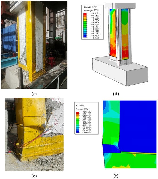 Comparison of failure behaviors (experimental vs. FEM). (a) experiment (Front view); (b) FEM (front view); (c) experiment (side view) (d) FEM (side view); (e) experiment (corner of steel frame); (f) FEM (corner of steel frame).