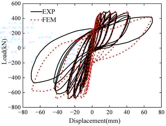 To ensure the accuracy of the finite element model, the hysteresis curve for the extracted finite element analysis is shown in Figure 10 against that for the experiment. It can be seen that the finite element analysis accurately simulates the hysteretic behavior of the specimen. The yield load, peak load and initial stiffness data for the test and the finite element analysis are compared in Table 3. The errors for all the data are within 10%, which shows that the finite element analysis has good accuracy.