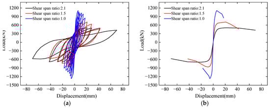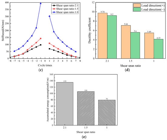 Three shear span ratios (2.1, 1.5, 1.0) were identified to study the effect of the shear span ratio on the seismic performance of the TSCCW. Figure 11 shows the effect of different shear span ratios on the results. It can be seen that as the shear span ratio decreases, the load carrying capacity and stiffness of the TSCCW increase significantly. When the shear span ratio decreases from 2.1 to 1.0, its positive and negative peak loads increase by 110% and 83%, respectively. Its positive and negative initial stiffness increased by 333% and 302%, respectively. However, reducing the shear span ratio will weaken the deformation capacity and energy dissipation capacity of the TSCCW. When the shear span ratio was reduced from 2.1 to 1.0, its ductility coefficients in the positive and negative directions decreased by 44% and 55%, respectively, and its cumulative energy consumption decreased by 41%.
