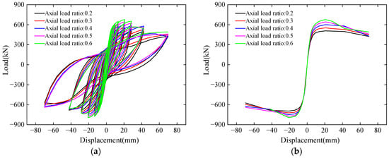 Finite element models of the TSCCW with five axial load ratios of 0.2, 0.3, 0.6, 0.5 and 0.6 were developed for seismic performance studies. The results obtained from the calculation of each model are illustrated in Figure 12. The load carrying capacity and stiffness of the TSCCW increased with an increase in the axial load ratio. When the axial load ratio was increased from 0.2 to 0.6, the peak loads in the positive and negative directions of the TSCCW increased by 31% and 10%, respectively, and its initial stiffness in the positive and negative directions increased by 32% and 4%, respectively. Meanwhile, the ductility coefficient of the TSCCW increases and then decreases with an increasing axial load ratio, and the best deformability is achieved at an axial load ratio of 0.4. The cumulative energy consumption decreases slowly from an axial load ratio of 0.2 to 0.5, with only a 4% decrease in the axial load ratio from 0.2 to 0.5. However, the decrease increases to 42% when the axial pressure ratio reaches 0.6. Therefore, for the TSCCW, the axial load ratio can be increased appropriately, but the axial load ratio should not be too large. When the axial load ratio is 0.4, the TSCCW can obtain better performance.