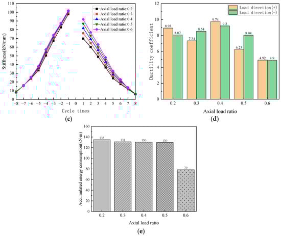 Effect of axial load ratio on mechanical properties of TSCCW. (a) Hysteresis curves; (b) skeleton curves; (c) stiffness degradation; (d) ductility coefficient; (e) accumulated energy consumption.