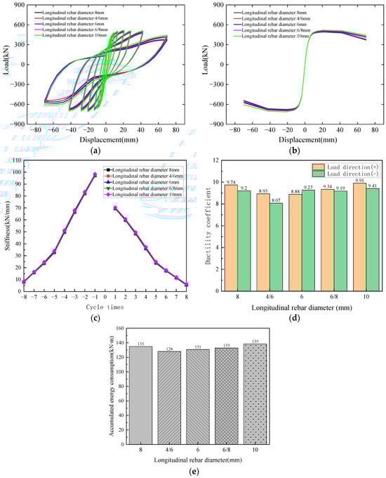 Effect of longitudinal rebar diameter on mechanical properties of TSCCW. (a) Hysteresis curves; (b) skeleton curves; (c) stiffness degradation; (d) ductility coefficient; (e) accumulated energy consumption.