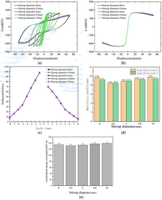 Effect of stirrup diameter on mechanical properties of TSCCW. (a) Hysteresis curves; (b) skeleton curves; (c) stiffness degradation; (d) ductility coefficient; (e) accumulated energy consumption.