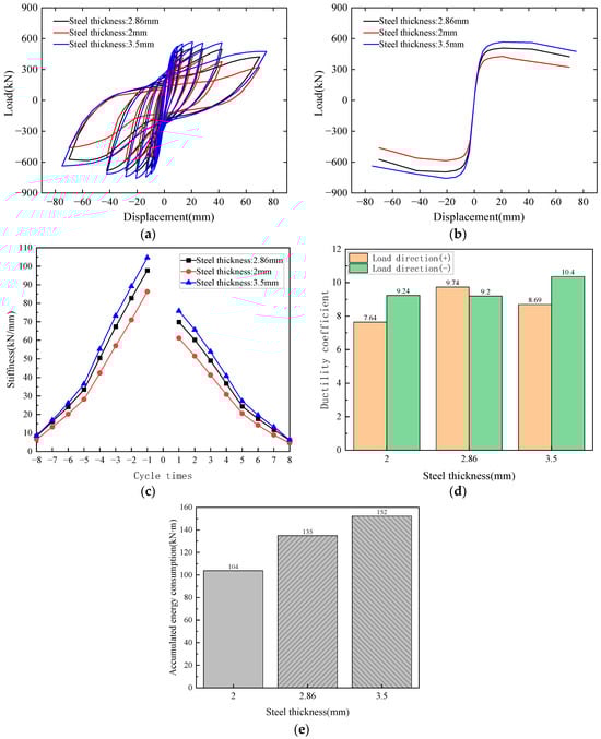 Effect of steel thickness on mechanical properties of TSCCW. (a) Hysteresis curves; (b) skeleton curves; (c) stiffness degradation; (d) ductility coefficient; (e) accumulated energy consumption.
