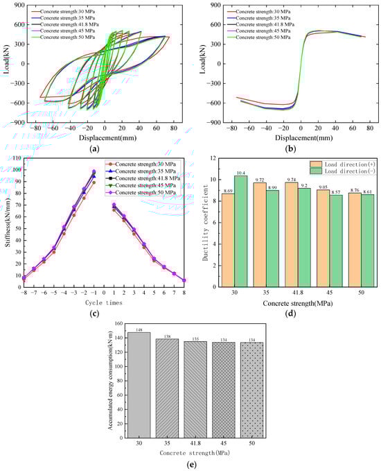 Effect of concrete strength grade on mechanical properties of TSCCW. (a) Hysteresis curves; (b) skeleton curves; (c) stiffness degradation; (d) ductility coefficient; (e) accumulated energy consumption.
