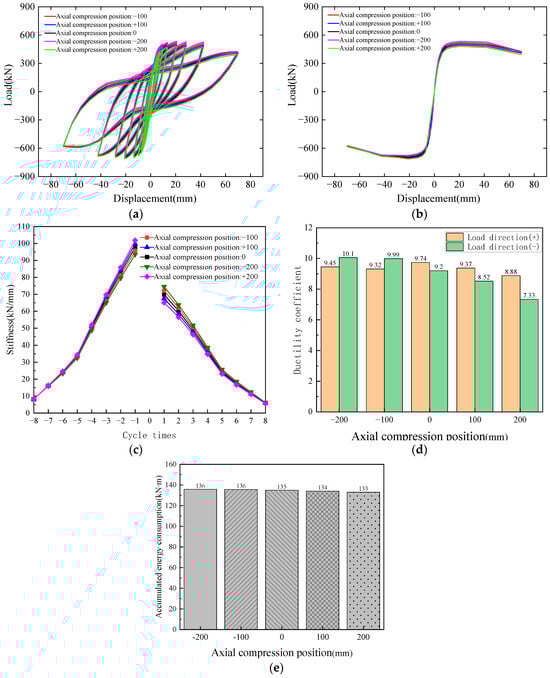 The TSCCW is a T-shaped shear wall, and its vertical pressure is not necessarily at the axial position in the actual structure, which may affect the mechanical properties of the TSCCW when the axial pressure is offset. A total of five models are established to study the effect on seismic performance when the axial pressure position is 0 and is offset by 100 and 200 mm in the positive and negative directions, respectively. The obtained results are shown in Figure 17. It can be seen that when the axial pressure position is moved in the positive direction, the bearing capacity in the positive direction becomes smaller and the stiffness becomes smaller, but the bearing capacity and stiffness in the negative direction will increase. When the axial pressure position is moved in the negative direction, the load carrying capacity in the positive direction becomes smaller and the stiffness becomes larger, but the load carrying capacity and stiffness in the negative direction increase and decrease. However, the axial pressure position has little effect on the energy dissipation capacity of the TSCCW.