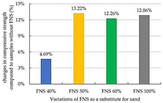 Changes in compressive strength due to variations of FNS as a substitute for sand compared to concrete samples without FNS.