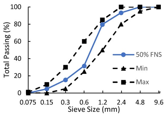 The fine aggregate composition comprised 50% FNS and 50% M-sand, based on the total weight of the fine aggregate. This proportion was chosen based on optimal testing results from previous research by Ernawan et al. [21]. The properties of the fine aggregate with 50% FNS are presented in Table 1, with its particle size distribution shown in Figure 2. The particle size distribution of M-sand only (0% FNS) and FNS only (100% FNS) could be found in [21]. An X-ray fluorescence (XRF) test was conducted to determine the chemical composition of the FNS [21]. It was observed that the main components of the FNS are Silicon Oxide (46.91%), Magnesium Oxide (29.28%), Ferric Oxide (15.10%), and Aluminum Oxide (4.04%). This composition aligns closely with that of natural sand, primarily consisting of SiO2. The specific gravity of FNS is 2.93 g/cm³ [20]. The properties of the fine aggregate with 50% FNS substitution and the coarse aggregate are presented in Table 1. The concrete mix proportion by using 50% FNS as fine aggregates substitution from previous research was used as shown in Table 2. The magnitude of w/c ratio utilized was 0.412.