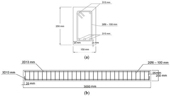 Three RC beams measuring 15 cm × 25 cm × 300 cm with 50% FNS fine aggregate were made and labeled as RC Beam 1, RC Beam 2, and RC Beam 3. Detailed information of the beams is shown in Table 3 and Figure 3. Additionally, cylindrical concrete specimens were prepared to provide compressive and split tensile strength data to be used later in the numerical model.