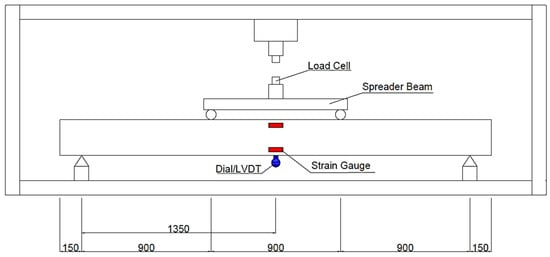The fourth-point loading on the RC beam specimens will be performed under semi-cyclic loading conditions. The RC beam specimens were tested at 28 days of age. The homogeneity of the RC beam specimens was evaluated using the ultrasonic pulse velocity test (UPV test). The UPV test for concrete were conducted in accordance with ASTM Standard C597 [36]. A direct method was utilized to measure the pulse’s velocity propagated through the RC beam specimen, as shown in Figure 4.
