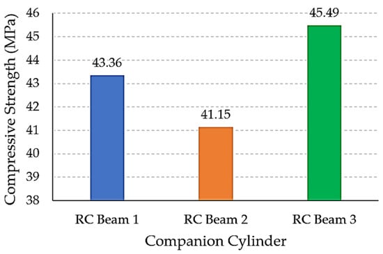 The average compressive strengths of the companion cylinders for RC Beams 1, 2, and 3 are recorded at 43.36 MPa, 41.15 MPa, and 45.49 MPa, respectively (Figure 9). The average compressive strength value of the companion cylinders from the three beams is 43.3 MPa. This magnitude closely aligns with the compressive strength data obtained in previous research [21], differing by only 4.7%. The average tensile strength value of the companion cylinders from the three RC beams is 2.4 MPa. The average compressive and tensile strength values of the companion cylinders from the three RC beams will be used as one of the input parameters in creating the numerical model of the RC beam in CAST3M.