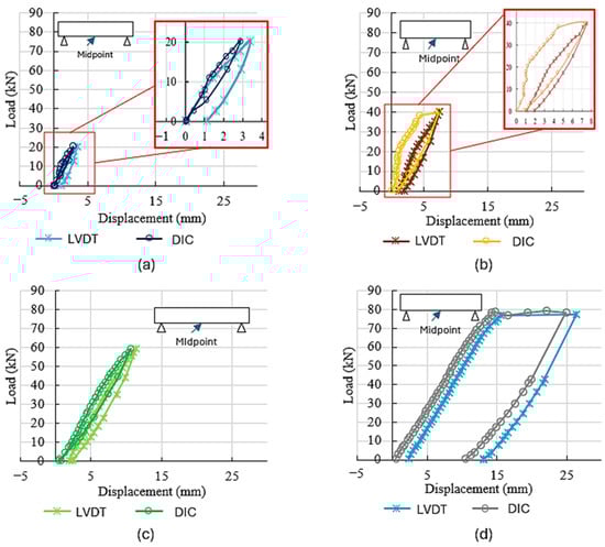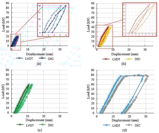 Load–displacement curves obtained from LVDT and DIC measurements on RC Beam 2: (a) Cycle 1, (b) Cycle 2, (c) Cycle 3, and (d) Cycle 4.