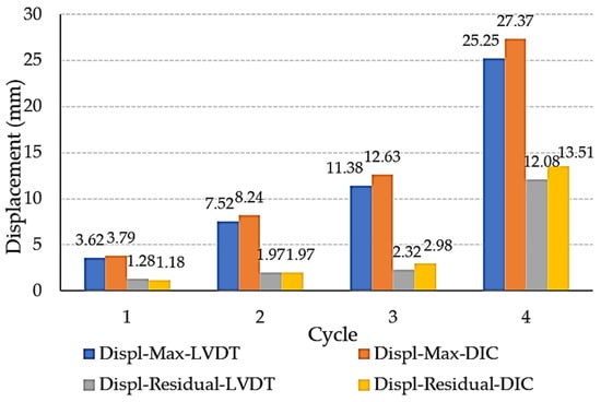 In the first cycle (Figure 11a), it is observed that the DIC results show a displacement 0.51 mm smaller than the LVDT readings at maximum load and 1.07 mm smaller upon load release. In the second cycle (Figure 11b), the DIC results indicate a displacement 0.18 mm smaller than the LVDT readings at maximum load and 1.07 mm smaller upon load release. In the third cycle (Figure 11c), the DIC results reveal a displacement 0.86 mm smaller than the LVDT readings at maximum load and 1.51 mm smaller upon load release. This consistent difference between LVDT and DIC tests on the beam suggests a recurring pattern. In the fourth cycle (Figure 11d), the maximum displacement derived from DIC analysis is also smaller than the LVDT results by 1.35 mm. Upon release of all loads, the DIC results show a displacement 2.53 mm smaller than the LVDT results. The summary of displacement values between LVDT and DIC methods for RC Beam 1 can be seen in Figure 12.