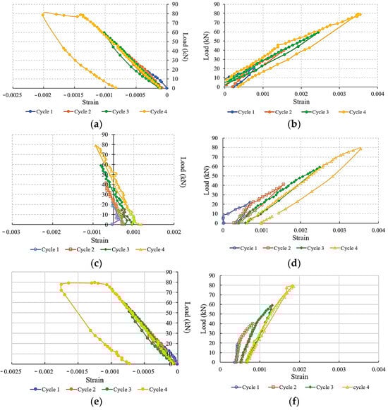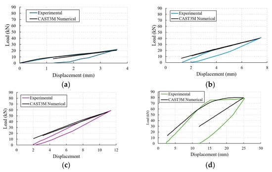 Comparison of deflection results at the midpoint of the beam between CAST3M modeling and experimental testing is presented in Figure 34. In the first cycle (Figure 34a), the model deflection closely resembles the experimental results until reaching the maximum load. After unloading, the model deflection could not exhibit residual deflection in the beam, where the model beam deflection appears to return to 0. The model deflection at the end of the cycle is adjusted to have residual deflection like the test results. However, the modeled residual deflection does not occur at a load of 0. This limitation is due to the Mazars concrete model, where the modeled concrete remains entirely elastic and lacks unrecoverable deformation [39,45], theoretically resulting in no residual deflection if the beam is still in the elastic phase.