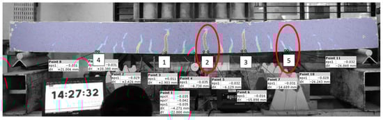 Digital Image Correlation (DIC) is a measurement technique used for evaluating displacement, contours, deformation, vibration, and strain. The DIC method utilized in this study represents a further advancement from previous research [21,38,39,40,41]. These studies analyzed the motion of speckles within the captured digital images of RC beam specimens’ surface under a four-point load flexural test.