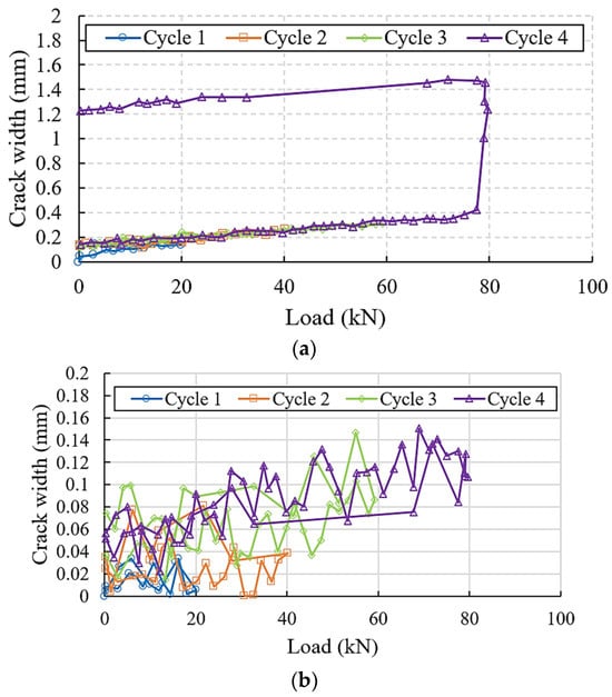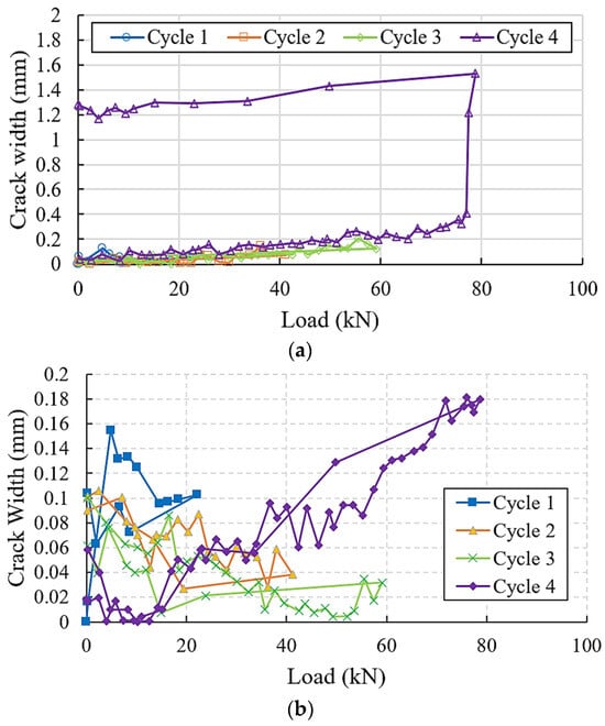 The comparison of load–displacement curves between LVDT and DIC measurements for RC Beam 2 across loading cycles 1, 2, 3, and 4 is shown in Figure 13.