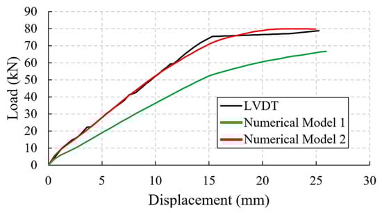 The results of the beam model response using cube parameters are presented in Figure 32. It is evident that the model response does not closely align the beam test results (LVDT vs. numerical model 1). To address this issue, additional numerical parameter studies are conducted. Using numerical model parameters 2 (modified Mazars) as shown in Table 9, the experimental results and the numerical model 2 curves closely align, as shown in Figure 32. Therefore, the numerical model 2 parameters (modified Mazars) will be used in modeling RC beams with the substitution of 50% nickel slag fine aggregate under semi-cyclic loading.