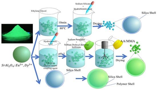 - Lyu, L.; Chen, Y.; Yu, L.; Li, R.; Zhang, L.; Pei, J. The Improvement of Moisture Resistance and Organic Compatibility of SrAl2O4: Eu2+, Dy3+ Persistent Phosphors Coated with Silica–Polymer Hybrid. Materials 2020, 13, 426. [Google Scholar] [CrossRef] [PubMed]