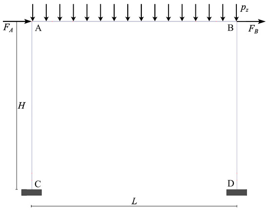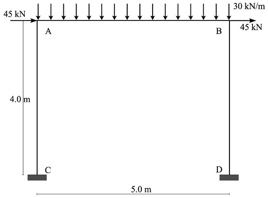 To validate the efficacy and the affordability of the proposed design strategy, reference has been made to a simple steel portal. In Figure 6, the schematic drawing of the structure is shown referring to the beam element axes together with the considered acting basic loads (dead load and perfect cyclic load ). Furthermore, an elastic perfectly plastic behaviour (, ) is assumed for the constituting material.