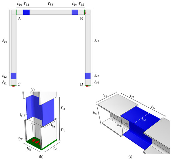 Steel frame (green: plate; red: bolts; blue: reduced section portion): (a) overall view; (b) detail 1, sketch of the beam-column connection; (c) detail 2, sketch of the column base.