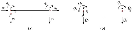 The explicit solution reported in Equations (20) and (21) can be exploited to conduct a nonlinear analysis by updating the values of the parameters and obtained by suitable integration of the constitutive laws at each Gauss cross-section. For this purpose, the solution of the stepped beam model in Equations (20) and (21) is adopted to introduce a beam/column element, connecting joints and , in the plane as shown in Figure 4. The vectors , , collecting the nodal displacements , and the nodal forces , , respectively, reported in Figure 4, are introduced.