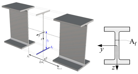 The stiffness matrix of the beam element defined in Figure 4, representative of the beam/columns of the discontinuous frame designed by means of the optimisation procedure described in the previous sections, can now be built. Precisely, according to a fibre approach, each Gauss cross-section at , , is discretised into strips (denoted as fibres), as in Figure 5, with an area , . Each fibre undergoes a nonlinear uniaxial stress–strain relationship modelling constitutive behaviour characterised by the tangent modulus .