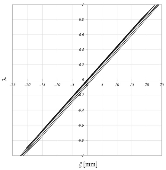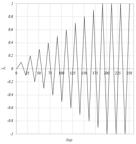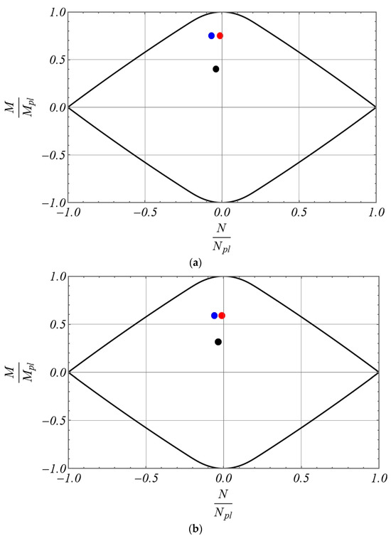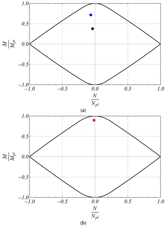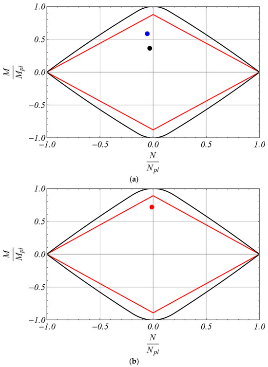 Furthermore, in order to account for the axial and flexural stiffness degradation due to the occurrence of plastic deformations during the nonlinear analysis, the stepped beam model with the cross-section discontinuities formulated in Equations (18) and (19) has been further enriched by means of the introduction of additional parameters which are updated during the inelastic analysis to take into account the axial and flexural stiffness degradation. Precisely, the parameters introduced in Equations (18) and (19) take the initial values , corresponding to a fully elastic state, and are subjected to a step-by-step updating within the range , being corresponding to a fully plastic state of the relevant Gauss cross-section.