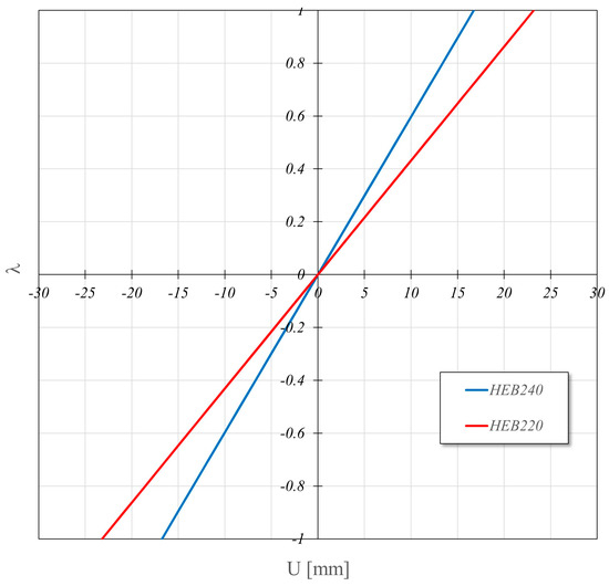 The step-by-step evaluation of the stiffness parameters , , in accordance to Equations (38) and (39), allows the updating of the SDSFs in Equations (27)–(33), of the deformation matrix in Equation (35) and of the element stiffness matrix in Equation (37). The smart character of these matrices allows the adoption of a single SDB element for each beam/column preventing any sub-discretisation.