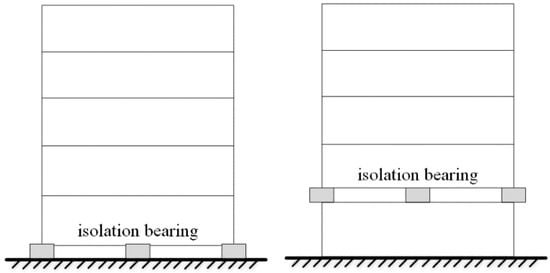 Seismic isolation technology in buildings involves the installation of isolation devices with relatively low lateral stiffness and high deformation capacity at the base or at a certain height of the structure. This is performed to reduce the energy input from seismic actions to the upper floors, thereby diminishing the seismic response of these floors [34]. A schematic of the seismic isolation principle is shown in Figure 1. The horizontal seismic forces that the building structure withstand are represented by
