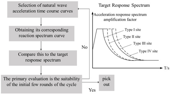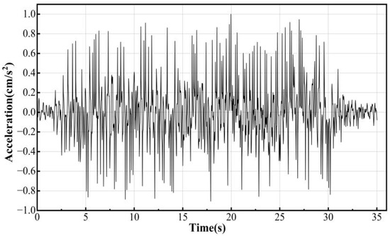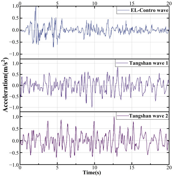 According to the Code for Seismic Design of Buildings (GB 50011-2010) [35], when using the dynamic time-history response analysis method, it is required to select no fewer than two sets of actual strong-motion records and one set of artificially simulated acceleration time-history curves based on the building site category and seismic design grouping. The engineering background of the building structure in this paper is a six-story student dormitory with a height of 22.5 m located in Haikou City, Hainan Province. For the reference building in this study, three sets of actual strong-motion records and one set of artificially simulated acceleration time-history curves are adopted to obtain relatively reliable and rational results. The selected seismic waves in this study are all far-field earthquakes, with PGA/PGV values around 6.0. The amplitude of the acceleration time-history curve for frequent earthquakes is 1.4 m/s2. To achieve the desired acceleration amplitude, we normalized the four earthquake waves. Then, we scaled them according to the PGA, amplifying the normalized seismic sequences to 1.4 m/s2 to achieve the desired seismic effect, and the scaling of the records is 1.4. The three essential characteristics of seismic waves are amplitude, spectral characteristics, and duration. The amplitude is determined by the peak acceleration and the design seismic intensity, while the spectral characteristics are considered through the site’s predominant period and the distance from the epicenter. The durations are typically selected in the range from 5T to 10T. The term T denotes the first natural period of the analyzed building structure, which is approximately 0.7 s for the building adopted in this study. The Tangshan and El Centro waves are selected as natural waves, with the selecting procedures shown in Figure 3. The time history of accelerations for the selected seismic waves are shown in Figure 4. The duration of all the selected natural waves exceeds 20 s.