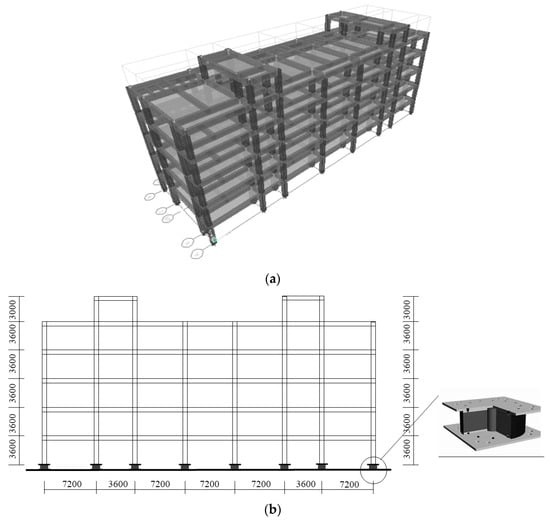 In the equations, the terms , , and represent the diameter of the isolator, the maximum axial force of the isolator actioning on the isolator, and the maximum allowable stress of isolators, which is 12 MPa herein. According to the selection approach described above, the seismic isolators adopted in this study include five types, which are LRB300, LRB400, LRB500, LRB600, and LRB700. Under every seismic isolation scheme, namely base isolation and from first- to fifth-floor isolation schemes, the elevations at the bottom of the isolation layer are 0.00 m, 3.35 m, 6.95 m, 10.55 m, 14.15 m, and 17.75 m, respectively. In all schemes, the height of the isolation layer is consistently 0.25 m.
