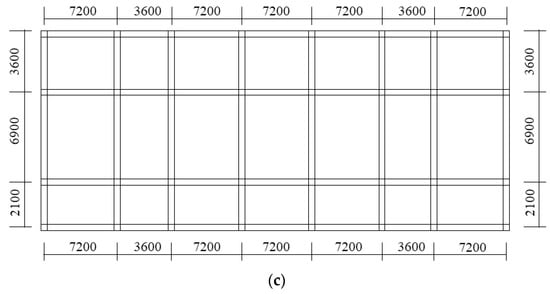 Structural model and framework: (a) model of non-seismic isolation structure; (b) building elevation frame; (c) floor plan frame.