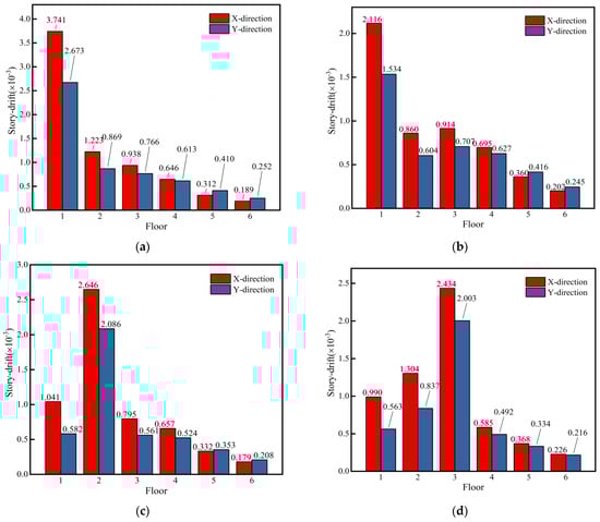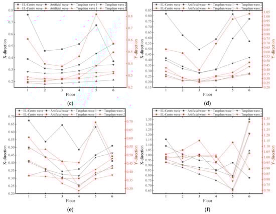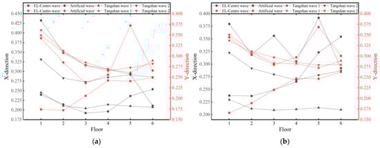 The inter-story shear forces of the isolated model are analyzed to determine the horizontal damping factor for each isolation scheme. According to the “Code for seismic design of buildings” (GB50011-2010) [35], the horizontal damping factor for multi-story buildings is defined as the maximum ratio of the inter-story shear forces of each floor under isolated and non-isolated conditions, calculated elastically. The ratios of the inter-story shear forces in the X- and Y-directions for each isolation scheme under four seismic waves compared to the non-isolated condition are shown in Figure 9. The results indicate that, excepting the fourth- and fifth-floor isolation schemes, the inter-story shear forces for the other isolation schemes are reduced to varying degrees compared to the non-isolated structure. Based on the results in Figure 9, it can be observed that the inter-story shear ratio varies significantly under different earthquake wave excitations. Therefore, we plotted the average horizontal seismic damping factors for each floor, as shown in Figure 10. The results indicate that for the base and first- to fifth-floor isolation schemes, the maximum X-direction seismic damping factors for the upper structure above the isolation layer are 0.368, 0.399, 0.413, 0.511, 0.474, and 0.794, respectively, while those in the Y-direction are 0.430, 0.452, 0.454, 0.576, 0.497, and 0.859, respectively. These results demonstrate that when the isolation layer is positioned lower, the damping factor is smaller, indicating a more significant seismic reduction effect. Among these, the base, first-floor, and second-floor isolation schemes exhibit excellent isolation performance. However, when the isolation layer is set high, such as in the fifth-floor isolation scheme, although the maximum reduction coefficient of the upper structure above the isolation layer is relatively low at 0.859, the damping factor of the lower structure is significantly high, even exceeding 1. This means that the inter-story shear force is amplified compared to the non-isolated condition.