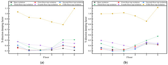Damping factors in the X- and Y-directions for isolation schemes: (a) base isolation; (b) first-floor isolation; (c) second-floor isolation; (d) third-floor isolation; (e) fourth-floor isolation; (f) fifth-floor isolation.